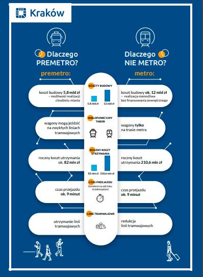 Na infografice porównano premetro i metro pod względem kosztów budowy – 5,8 mld zł (premetro – zaznaczono, że jest możliwość realizacji z budżetu miasta), ok. 12 mld zł (metro – podkreślono, że nie ma możliwości realizacji bez finansowania zewnętrznego). Podano, że wagony premetra mogą jeździć na zwykłych liniach tramwajowych, a metra tylko na dedykowanej dla tego środka transportu trasie. Wyliczono też roczny koszt utrzymania: ok. 82 mln zł (premetro), ok. 210,6 mln zł (metro). W przypadku czasu przejazdu podano, że wynosi ok. 9 minut tak w przypadku premetra jak i metra. Zaznaczono też, że budowa premetra wiąże się z utrzymaniem linii tramwajowych, a premetra z redukcją takich tras.