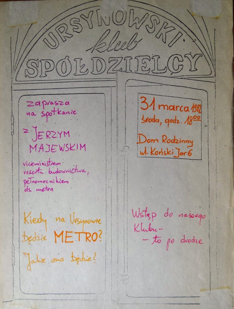 31 marca 1982 r. na moje zaproszenie Jerzy Majewski, pełnomocnik rządu ds. metra spotkał się z działaczami Ursynowskiego Klubu Spółdzielcy. Frekwencja w klubie „Dom Rodzinny” przy ul. Koński Jar była jak zwykle ogromna. Łaknęliśmy każdej informacji. UKS wystąpił z inicjatywą zorganizowania Społecznego Komitetu Budowy Metra. Uzyskałem poparcie Andrzeja Ziemskiego, redaktora naczelnego popularnego dziennika „Sztandar Młodych”, gdzie pracowałem jako dziennikarz. Po opublikowaniu apelu w gazecie zgłosiło się do mnie szereg osób. Przystąpiłem do organizowania Komitetu.