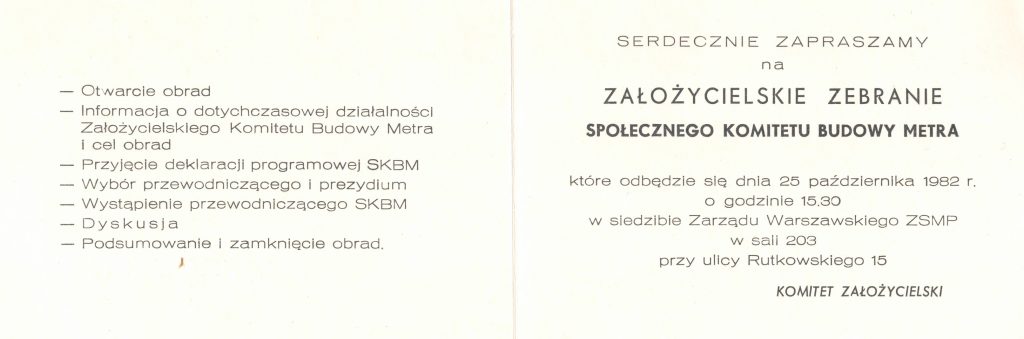 25 października 1982 r. o godz. 15.30 w siedzibie ZW ZSMP przy ul. Rutkowskiego 15 rozpoczęło się zebranie założycielskie SKBM. Niejednemu z „metrowców” zaszkliły się oczy. Nadzieja, ze tym razem metro zostanie zbudowane doprowadziła nas do powołania tego obywatelskiego Komitetu. Od razu więc SKBM stał się gwarantem odradzającej się inwestycji. Światła towarzyszące kamerze Telewizyjnego Kuriera Warszawskiego nabrały znaczenia symbolu – wszystko co towarzyszy budowie metra jest widoczne.
